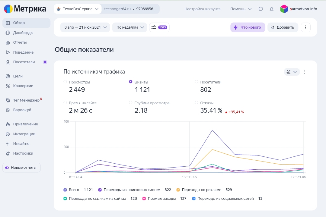 - Трафик нового сайта увеличился в несколько раз (более чем на 100%), достигнув 400 целевых клиентов в месяц заинтересованных в покупке промышленного газового оборудования, а это хороший результат для промышленного производственного предприятия